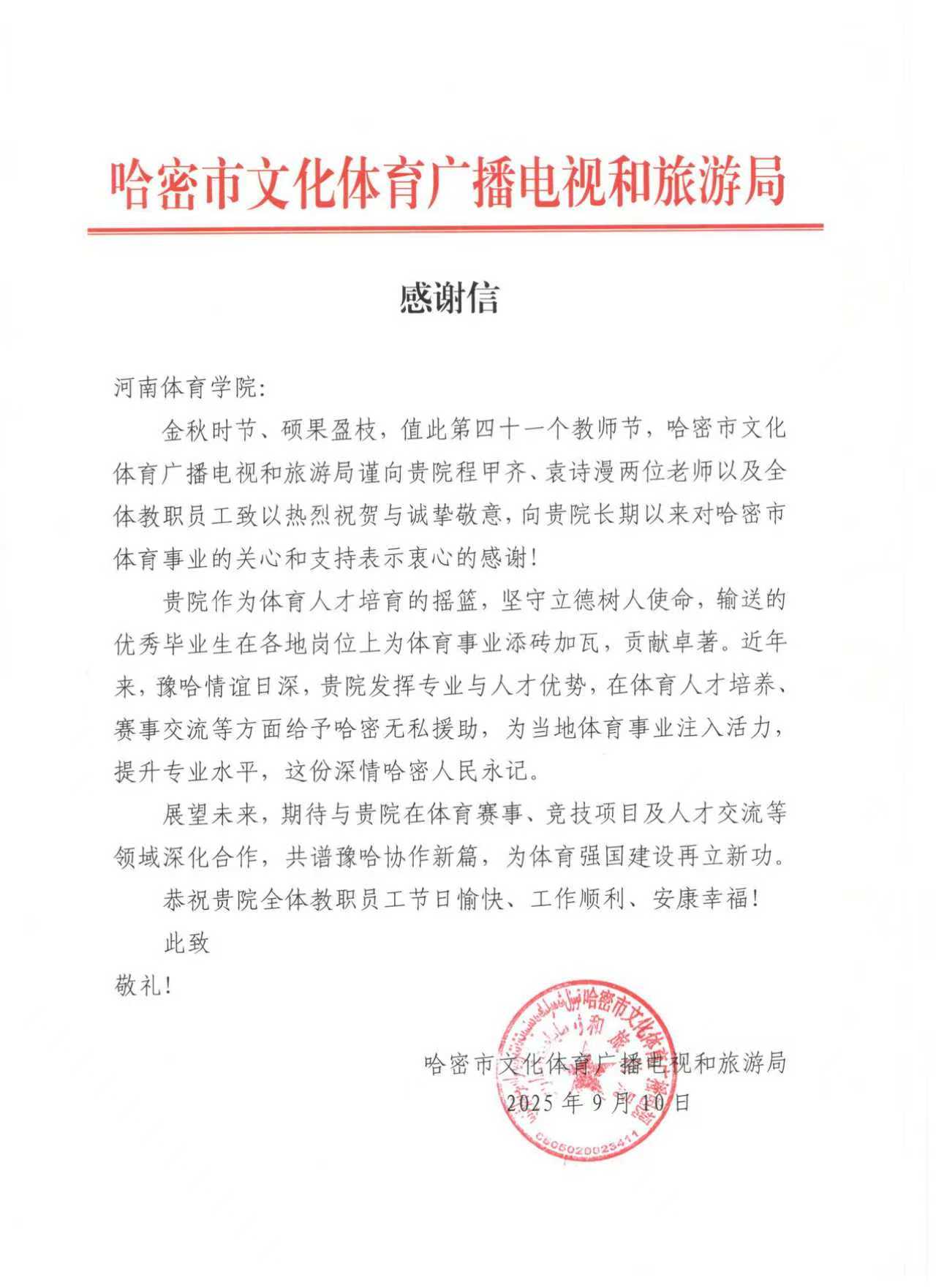 今天是9月10日,全国第41个教师节。今天,我校收到来自新疆哈密市文化体育广播电视和旅游局的《感谢信》,向我校选派的援疆教师程甲齐、袁诗漫以及全体教职工送来教师节的真情问候!纸短情长,字里行间流露着绵绵的豫哈深情。