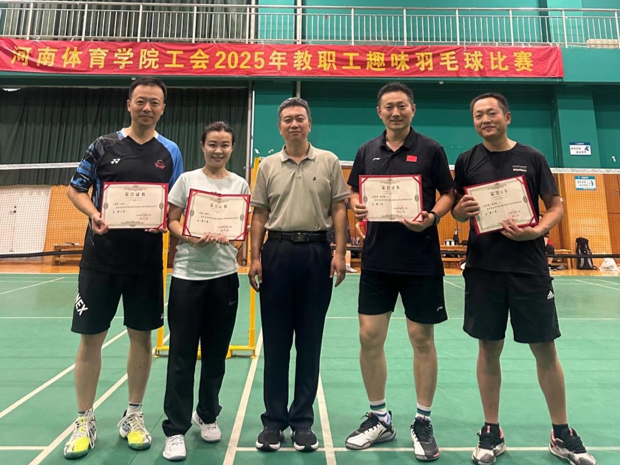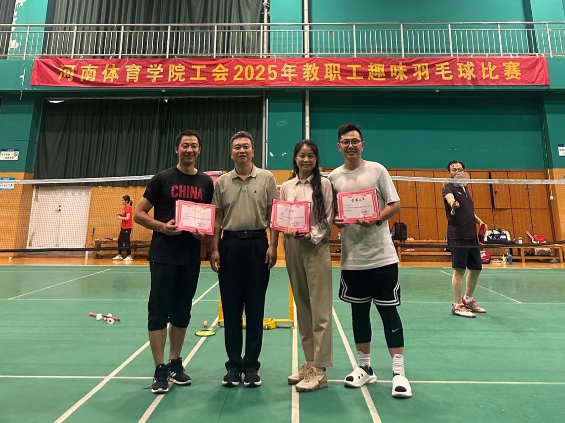 赛场上,教职工们一改课堂上严谨形象,化身活力四射的运动员,精准的扣杀、轻盈的吊球、默契的配合引得观众阵阵喝彩。各参赛选手都展现出了高超的竞技水平和协作精神。“趣味羽毛球”大大激发了教职工的参与热情,现场热闹非凡。经过紧张激烈的角逐,最终马宏剑、苏泽海组合(男子双打冠军)、曹坤、王艳组合(混双冠军)、韩开成、杨艳丽、雷小青(趣味组冠军)凭借出色表现摘得桂冠。赛后,由校党委副书记、工会主席刘丹宁为获奖选手颁发荣誉证书,并充分肯定活动对校园文化建设的积极意义。