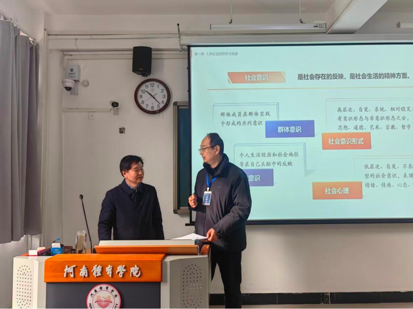 课堂上,张迪老师系统阐述了马克思主义唯物史观的核心要义,深入讲解了社会存在决定社会意识、社会基本矛盾运动规律等内容。校领导张学领凝神聆听、认真记录,仔细观察课堂互动与教学效果。 课后,校领导张学领与张迪老师进行深入交流,反馈听课意见,并就教学环节的衔接与优化、教学案例的精选与运用等,提出了针对性指导建议。他强调,《马克思主义基本原理》课程是对高校学生进行辩证唯物主义与历史唯物主义教育的思政主干课程,旨在引导学生运用马克思主义基本立场和根本观点认识和理解现实问题,培养其熟练运用科学的世界观与方法论分析和解决实际问题的能力。思政课教学要加强学情分析,精准把握体育院校学生的身心发展特点、学习需求和接受规律,开展深入细致的针对性教学。注重及时更新并不断丰富课程教学案例,加强师生有效互动,不断提升思政课的针对性和吸引力。