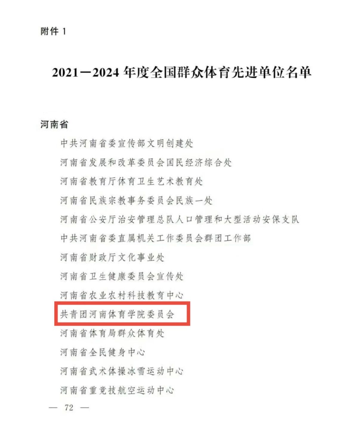 此次荣誉加持,既是对过往工作的肯定,更是对未来发展的鞭策。当前,全民健身上升为国家战略,体育事业正迎来前所未有的战略机遇期。河南体育学院将以此次表彰为新起点,持续加大对群众体育工作的支持力度,充分发挥专业与人才优势,深耕体育人才培养、科学研究与社会服务,引导广大师生以“兴体报国”为己任,将个人理想融入体育强国梦的壮阔征程,为推动全民健身战略实施、助力健康中国建设贡献更多河南体院力量!