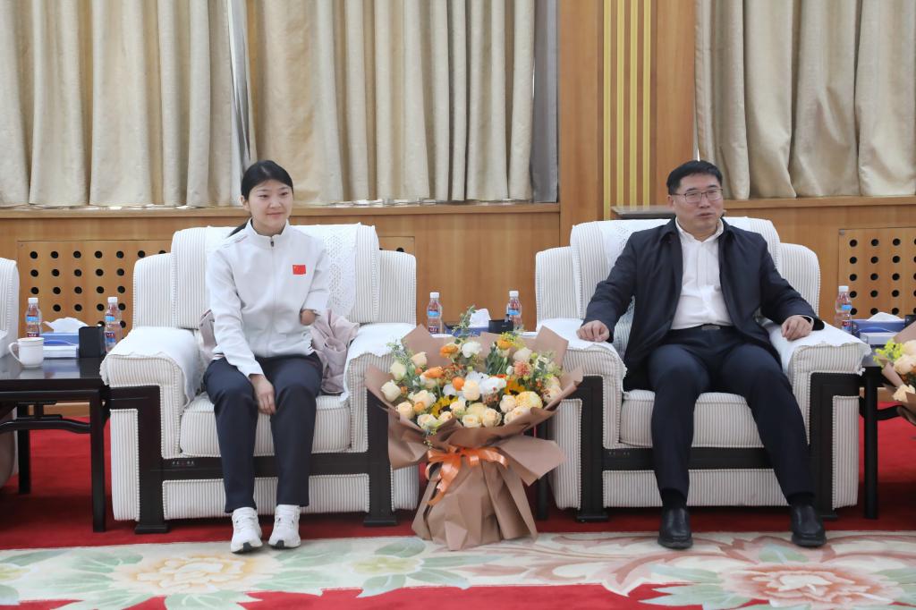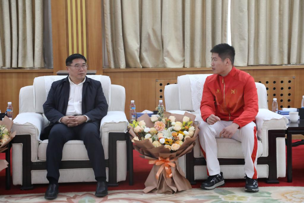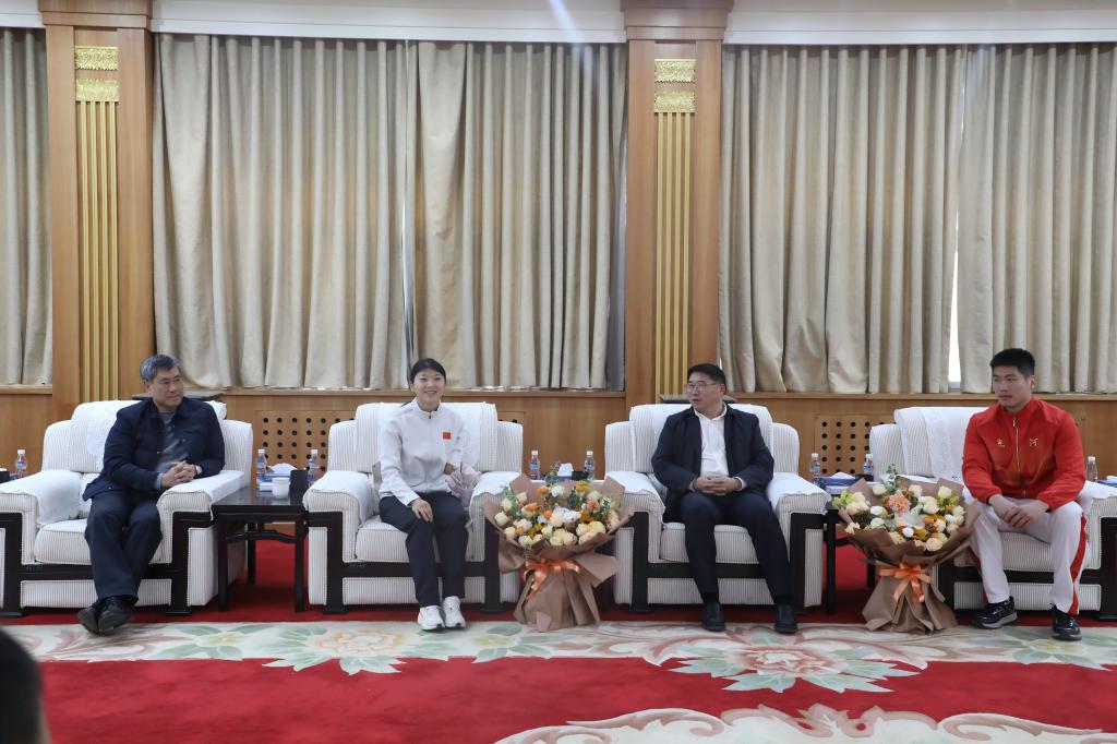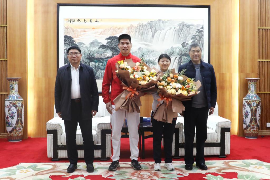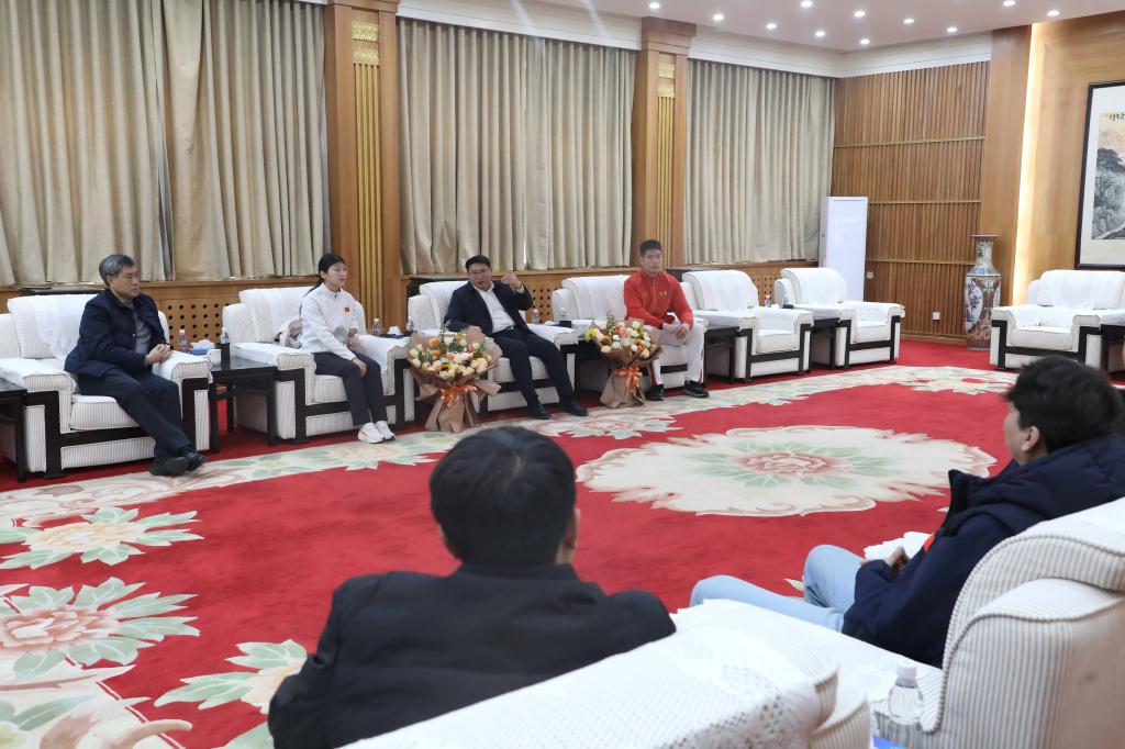 12月19日上午,校领导张大超、张原在校史馆贵宾室接见载誉归来的我省运动员、我校教师王少华、李露,为他们送上鲜花,并与他们亲切座谈。